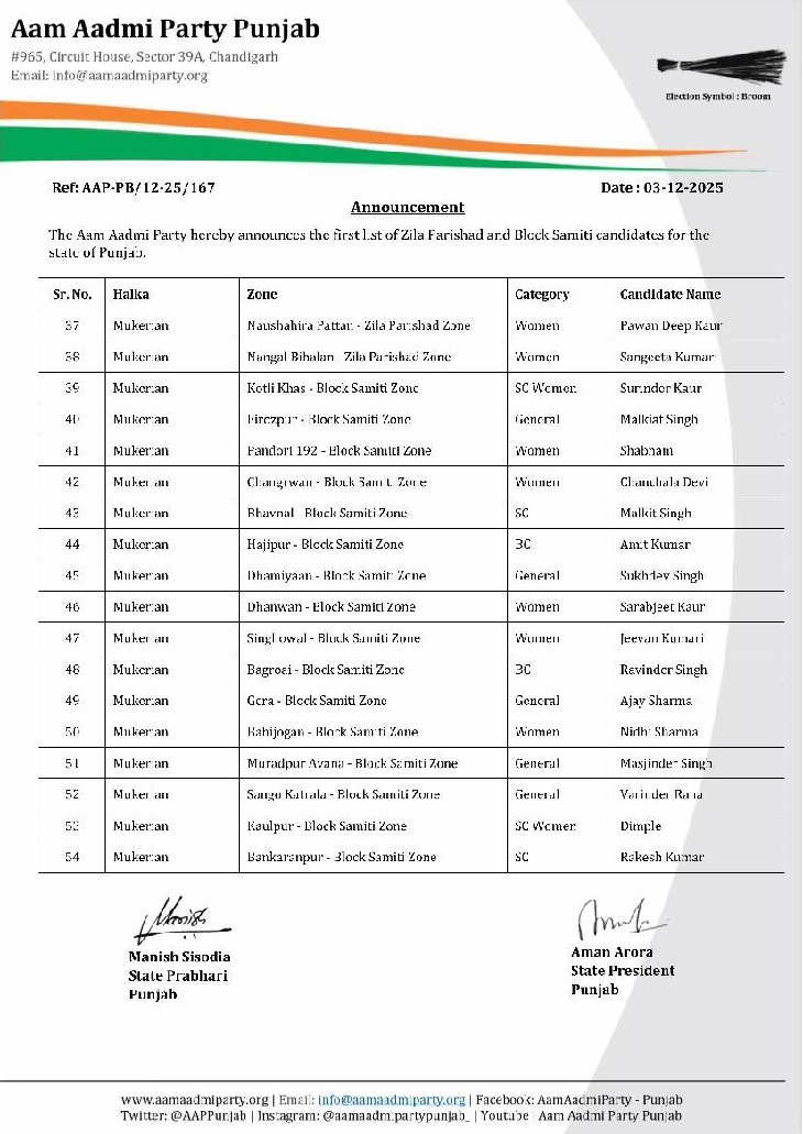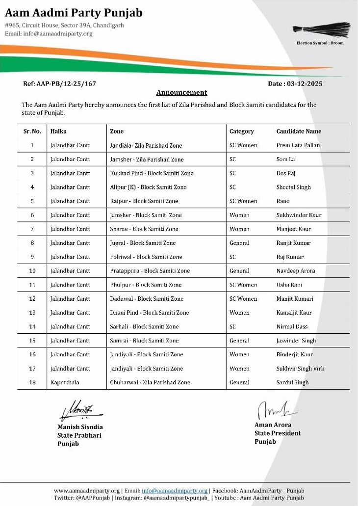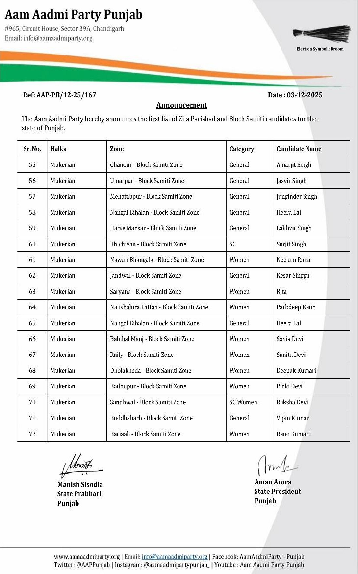 चंडीगढ़ । पंजाब में जिला परिषद व पंचायत समिति चुनाव के लिए चार दिसंबर तक नामांकन होने हैं। बीजेपी के बाद अब आम आदमी पार्टी ने भी पार्टी निशान पर चुनाव लड़ने का फैसला लिया है।72 उम्मीदवारों की पहली सूची जारी कर दी है। उम्मीद है कि जल्दी ही अन्य नाम भी जारी कर दिए जाएंगे।